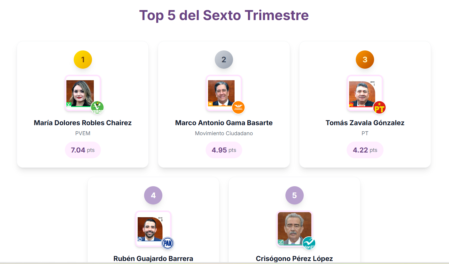 La Sexta Evaluación Trimestral de Congreso Calificado nos entregaresultados de contraste y diferenciación entre los legisladores. Solo una diputada obtuvo calificación aprobatoria, mientras losrestantes 26 reprobaron. En este trimestre,